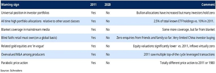 Mark Lacey, Head of Commodities Schroders, denkt dat de rally in goud en goudaandelen nog lang niet voorbij is. De goudprijs heeft de neiging tegen het einde van een cyclus scherp te stijgen, bijna in een rechte lijn. In 2011 schoot de prijs 15% omhoog in de maand voor de piek. In 1981 steeg de goudprijs 80% gedurende twee maanden. “We hebben een checklist opgesteld van waarschuwingssignalen, die moet helpen om beleggers te waarschuwen als het goud richting een bubbel beweegt. Er zijn opvallende verschillen tussen nu en 2011. De vraag komt zelfs op of er überhaupt wel sprake is van een bubbel.”